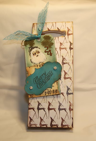 Jag har använt dessa tags som har fått ett stänk av akrylfärg på kanterna och sedan distressfärg Broken china. Jag har använt stämplar från Tim Holtz olika set. Tomten och grankvistar har fått en släng med Puffy Velvet penan. Utstansad dies, grungepapper, som blivit målad med Crackle paint, sandpapprad och distressad. Bradsen, skruvhuvuden, har fått vit akrylfärg dabbad på sig. Gamla notpapper, lite distressade. 24 är utstansat i Upon A Time Alphabet.